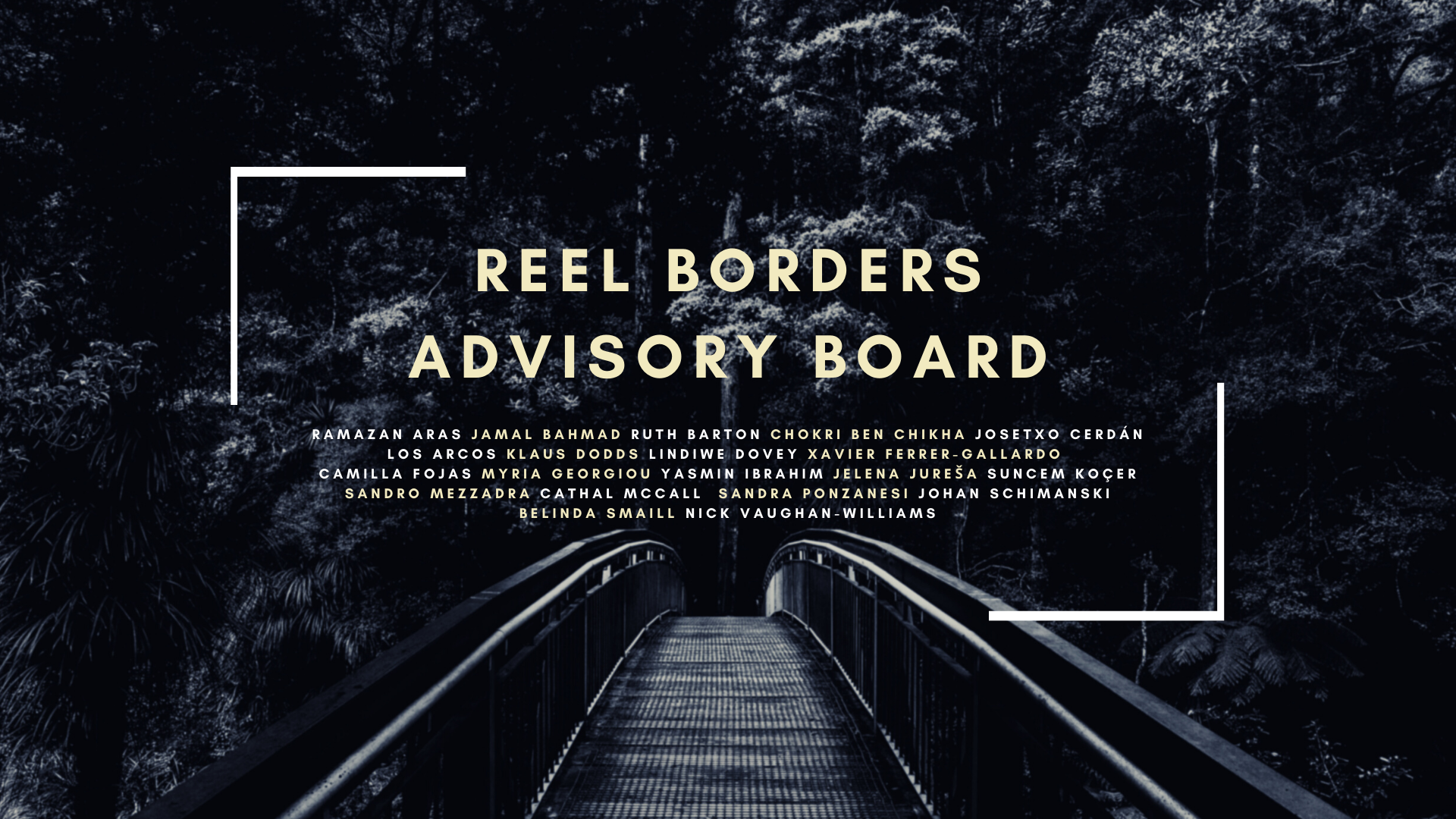 The members of the advisory board are: Ramazan Aras (Ibn Haldun University); Jamal Bahmad (Mohamed V University Rabat); Ruth Barton (Trinity College Dublin); Chokri Ben Chikha (KASK School of Arts); Josetxo Cerdán Los Arcos (University Carlos III of Madrid & Filmoteca Española); Klaus Dodds (Royal Holloway University of London); Lindiwe Dovey (SOAS University of London); Xavier Ferrer-Gallardo (Pompeu Fabra University); Camilla Fojas (Arizona State University); Myria Georgiou (London School of Economics); Yasmin Ibrahim (Queen Mary University London); Jelena Jureša (KASK School of Arts); Suncem Koçer (Kadir Has University); Sandro Mezzadra (University of Bologna); Cathal McCall (Queen’s University Belfast); Sandra Ponzanesi (Utrecht University); Johan Schimanski (University of Oslo); Belinda Smaill (Monash University); Nick Vaughan-Williams (University of Warwick)